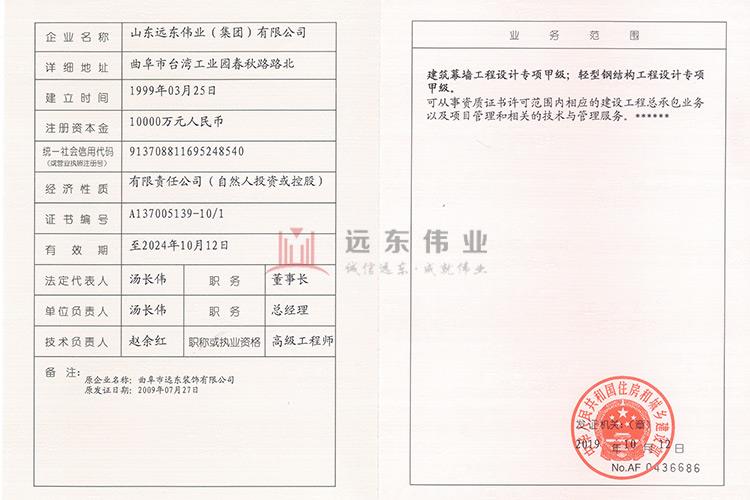2020-2021年度國(guó)家優(yōu)質(zhì)工程獎(jiǎng) 營(yíng)業(yè)執(zhí)照 安全生產(chǎn)許可證 企業(yè)資信等級(jí)證書 企業(yè)信用等級(jí)證書 質(zhì)量管理體系認(rèn)證證書 環(huán)境管理體系認(rèn)證證書 職業(yè)健康安全管理體系認(rèn)證證書 重合同守信用企業(yè) 建筑幕墻工程專業(yè)承包壹級(jí) 建筑工程施工總承包貳級(jí) 建筑裝修裝飾工程專業(yè)承包貳級(jí) 建筑幕墻資質(zhì) 建筑幕墻工程設(shè)計(jì)專項(xiàng)甲級(jí) 輕鋼鋼結(jié)構(gòu)工程設(shè)計(jì)專項(xiàng)甲級(jí) 工程設(shè)計(jì)資質(zhì)證書 鋼結(jié)構(gòu)工程專業(yè)承包壹級(jí) 工程設(shè)計(jì)與施工資質(zhì)證書 鋁合金窗節(jié)能認(rèn)證證書 企業(yè)集團(tuán)登記證 建筑幕墻工程專業(yè)承包壹級(jí) 建筑裝修裝飾工程專業(yè)承包貳級(jí) 塑料窗節(jié)能認(rèn)證證書 建筑裝飾工程設(shè)計(jì)專項(xiàng)乙級(jí) 共45記錄 ?上一頁 1 2 3 下一頁?